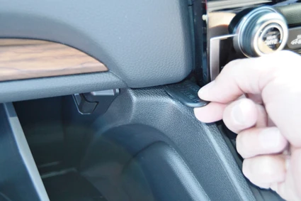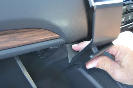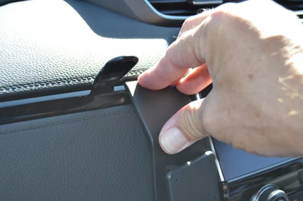 Press the thin lower edge of the ProClip into the gap next to the gap opener. Flip the upper part of the ProClip upward/forward so the lower edge hooks behind the lower section of the dashboard. Pull out the gap opener.