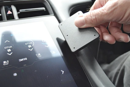 Use the enclosed alcohol pad to clean the area where the ProClip is to be installed. Peel off the adhesive tape cover on the ProClip. Press the thin edge on the upper part of the ProClip into the gap between the console frame and the display.