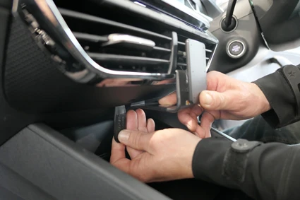 Use the enclosed alcohol pad to clean the area where the ProClip is to be installed. Peel off the adhesive tape covers on the ProClip. Press the thin end of the enclosed gap opener into the gap between the center console and the dashboard, to widen the gap. Hook the angled edge on the upper part of the ProClip over the frame surrounding the air vent.