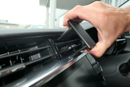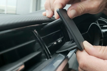 Use the enclosed alcohol pad to clean the area where the ProClip is to be installed. Peel off the adhesive tape covers on the ProClip. Hook the upper grooved edge under the inner frame surrounding the air vent.