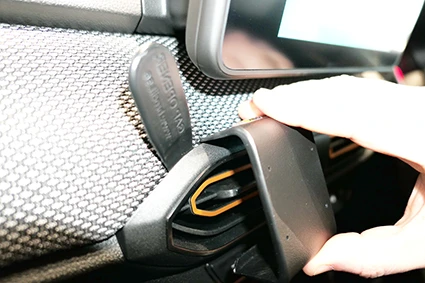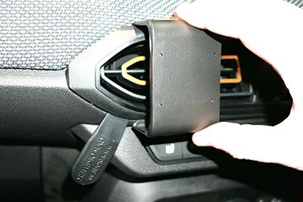 Hold the enclosed gap opener above the air vent and press the thin end into the gap between the frame surrounding the air vent and the dashboard, to widen the gap. Press the upper edge of the ProClip into the gap next to the gap opener.