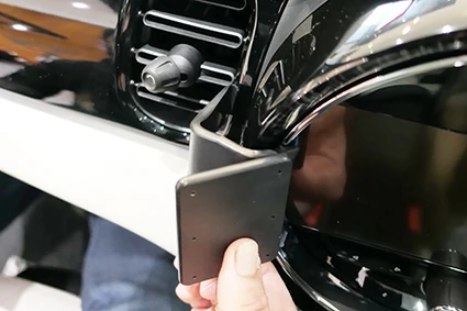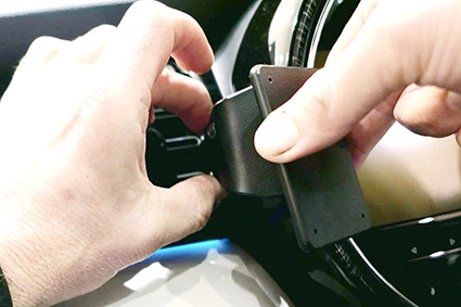 Pull the left part of the ProClip away from the dashboard. At the same time, press the left part forward and hook the angled edge between the air vent and the surrounding frame.
