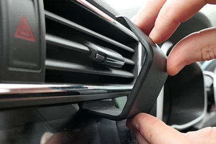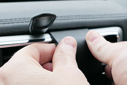 Press the thin end of the enclosed gap opener into the gap between the panel surrounding the air vent and the dashboard, to widen the gap. Pull the upper part of the ProClip upward/forward and hook the angled edge into the gap next to the gap opener. Press on the ProClip so the angled edges go all the way into the gaps. Pull out the gap opener.