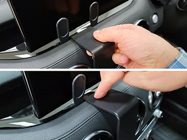 Press the gap openers into the gap between the frame surrounding the screen and the soft dashboard. Pull the upper part of the ProClip upward and forward, and hook the upper edge into the gap between the gap openers. Be careful not to scratch the soft dashboard with the mount. Press down on top of the mount so the edge goes all the way into the gap. Pull out the gap openers.