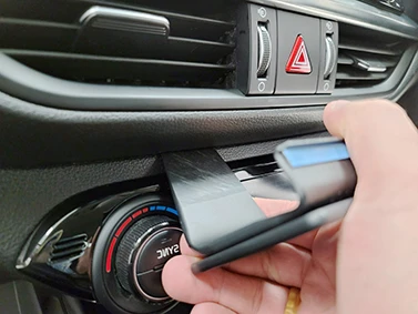 Press the thin end of the enclosed gap openers into the gap between the silver trim and the air vent, to widen the gap.