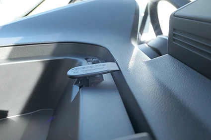 Use the enclosed alcohol pad to clean the area where the ProClip is to be installed. Open the compartment on top of the dashboard. Press the enclosed gap opener into the gap between the compartment and dashboard, to widen the gap. Peel off the adhesive tape cover on the ProClip.