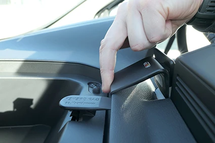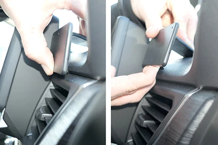 Place you fingers behind the mounting plate and pull the ProClip toward you. Hook the angled lower edge into the gap between the frame surrounding the air vent and the dashboard.