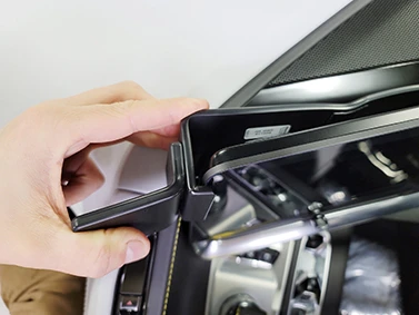 Place your thumb on the ProClip faceplate and your fingers on the main bend of the mount. Press forward with your thumb and toward you with your fingers. Hook the left edge of the ProClip around the screen so it grabs the front edge. (Do not pull to the left, it may cause the right edge to pull out from the gap.)