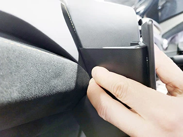 Press the upper edge of the left edge of the ProClip into the gap between the housing surrounding the screen and the dashboard panel above the glove box. The ProClip lip will slightly open the gap as it is inserted.