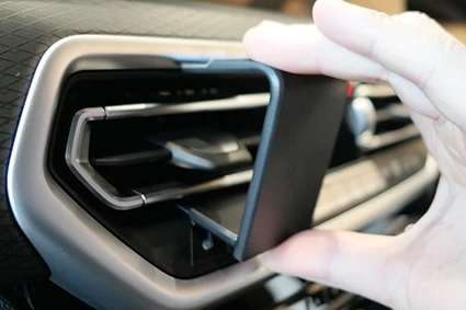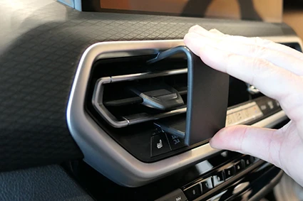 Use the enclosed alcohol pad to clean the area where the ProClip is to be installed. Peel off the adhesive tape covers on the ProClip. Press the angled edge on the lower part of the ProClip into the gap between the frame surrounding the air vent and the control panel.