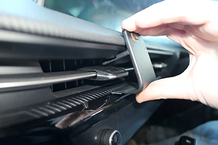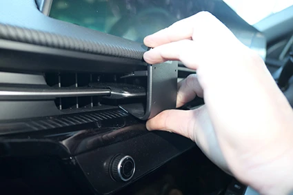 Use the enclosed alcohol pad to clean the area where the ProClip is to be installed. Peel off the adhesive tape covers on the ProClip. Press the angled edge on the upper part of the ProClip into the gap surrounding the air vent frame .