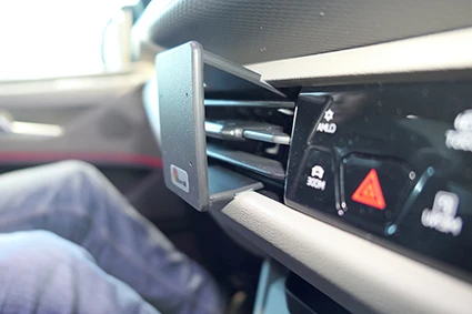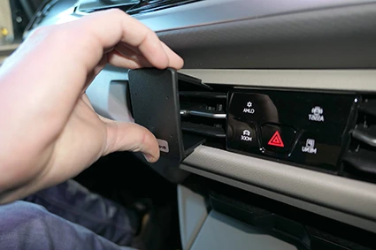 Press the lower part of the ProClip upward and forward. Hook the grooved edge on the lower part of the ProClip over the frame surrounding the air vent.
