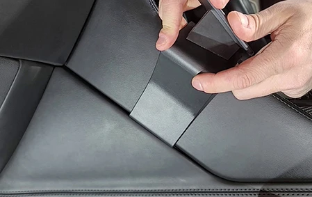 Use the enclosed alcohol pad to clean the area where the ProClip is to be installed. Peel off the adhesive tape covers on the ProClip. Press the lower edge of the ProClip into the gap in the center console sidewall.