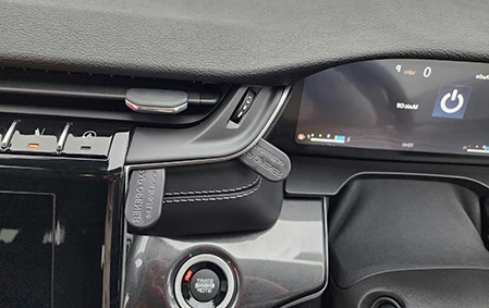 Use the enclosed alcohol pad to clean the area where the ProClip is to be installed. Insert the gap openers into the seam behind the leather trim next to the engine start button, on either side of the mount. (See photo). Apply even downward pressure that will flex the mount into the soft material and hook it underneath.