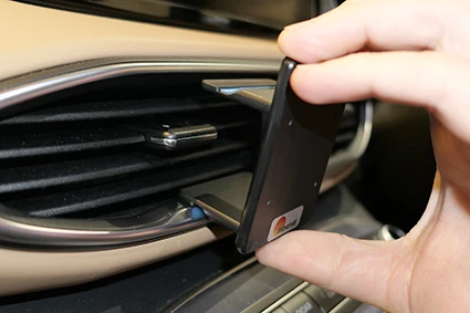 Use the enclosed alcohol pad to clean the area where the mount is to be installed. Peel off the adhesive tape covers on the mount. Hook the lower edge of the mount under the frame surrounding the air vent.