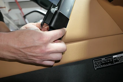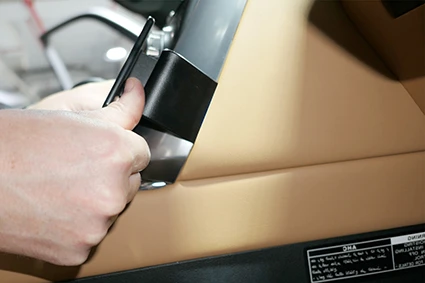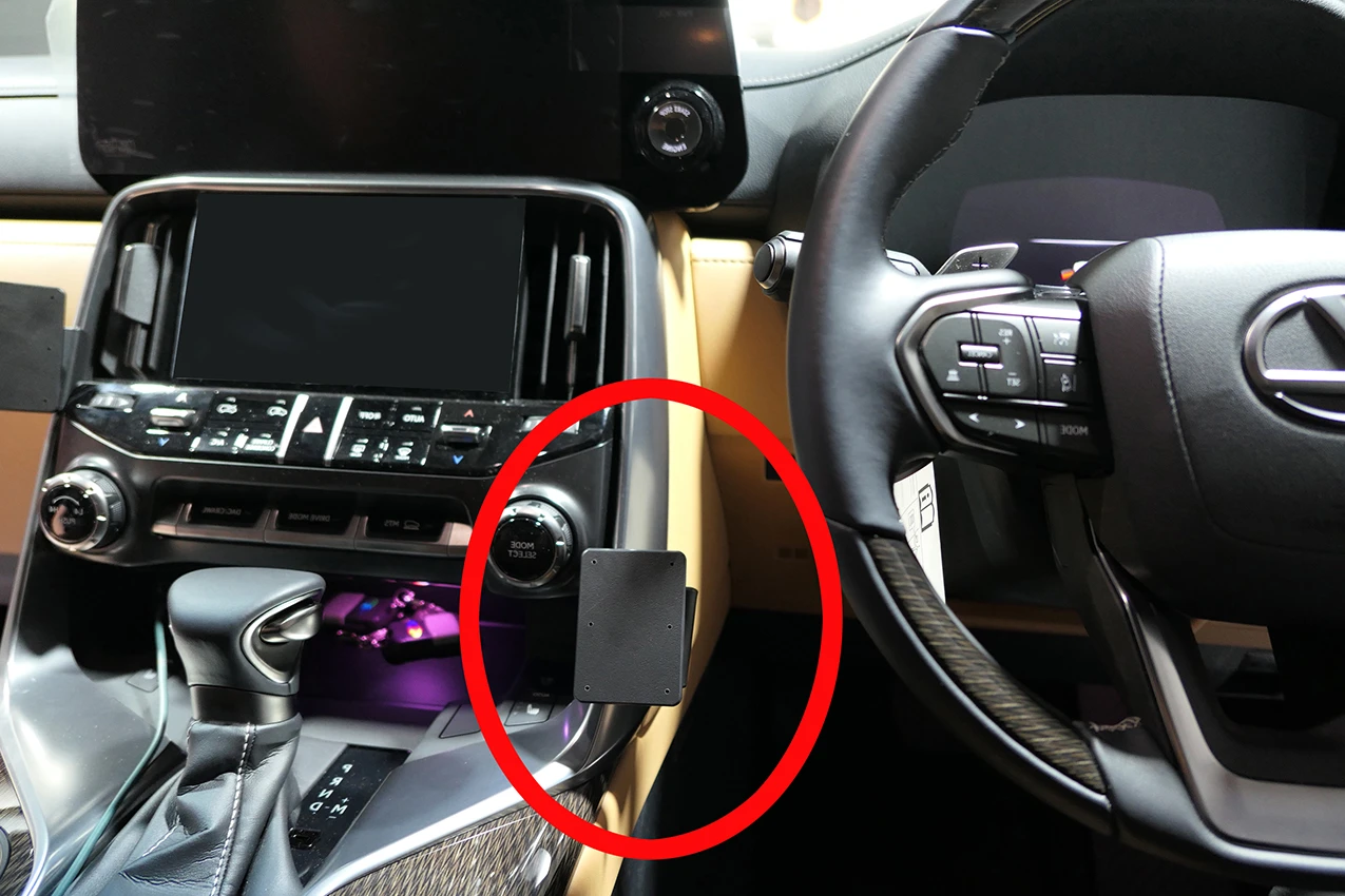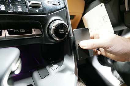 Use the enclosed alcohol pad to clean the area where the mount is to be installed. Peel off the adhesive tape cover on the mount. Hook the angled edge on the left part of the mount around the center console frame.