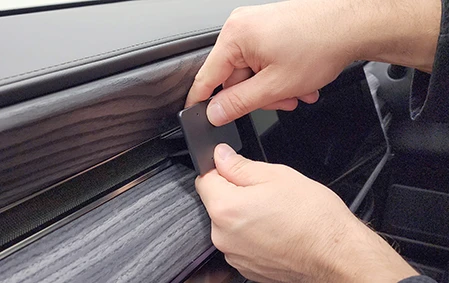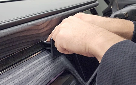 Use the enclosed alcohol pad to clean the area where the ProClip is to be installed. Peel off the adhesive tape cover on the ProClip. Press the angled edge on the lower part of the ProClip into the gap between the bottom air vent and the surrounding frame. Press downward so the angled edge goes all the way into the gap.