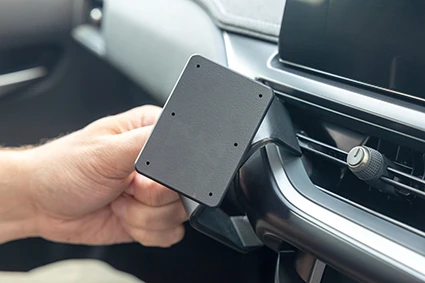 Use the enclosed alcohol pad to gently clean the area where the mount will be installed. Remove the backing from the adhesive tape. Place the top lip inside the right vent frame.