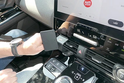 Use the enclosed alcohol pad to clean the area where the mount will be placed. Press the thin end of the enclosed gap opener into the gap between the air vent housing and the center console, to widen the gap. Peel off the adhesive tape cover.