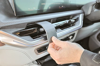 Use the enclosed alcohol pad to clean the area where the ProClip is to be installed. Peel off the adhesive tape covers on the ProClip. Place the upper part of the ProClip in the gap under the frame surrounding the air vent.