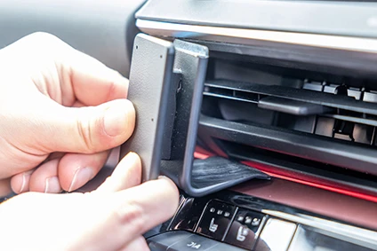 At first, press one coner of the lower edge of the mount into the gap between the frame surrounding the air vent and the trim. Then press all of the lower edge into the gap.