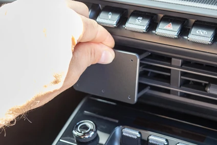 Use the enclosed alcohol pad to clean the area where the mount will be installed. Hold the mount so the attaching parts on the back are to the right. Peel off the adhesive tape cover. Hook the lower edge of the mount over the frame surrounding the air vent.