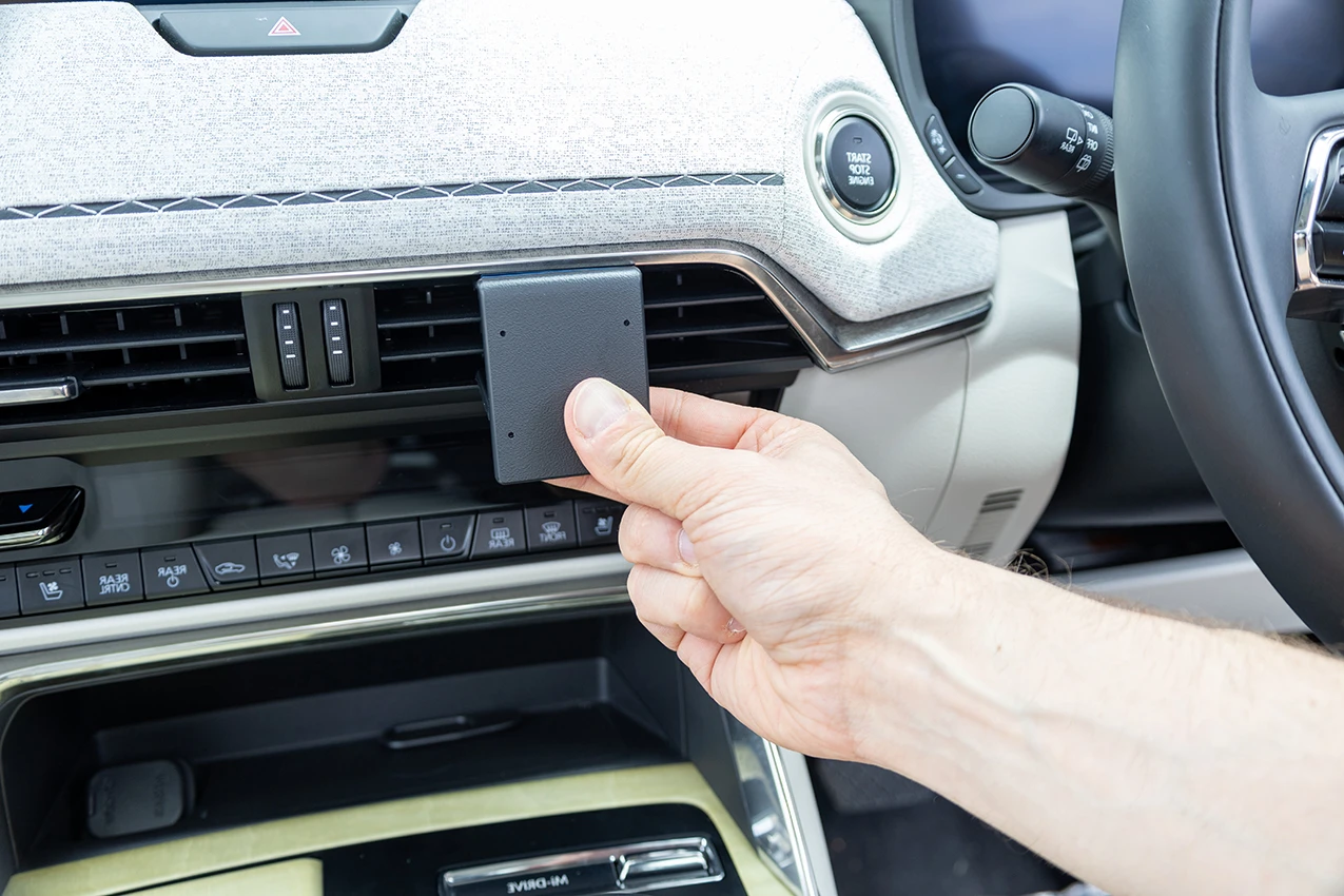 Press the thin end of the included gap opener into the gap between the air vent housing and the surrounding frame, to widen the gap. Use the enclosed alcohol pad to clean the area where the mount will be installed. Peel off the adhesive tape cover. Press the angled edge on the upper part of the mount into the opened gap. Pull out the gap opener.