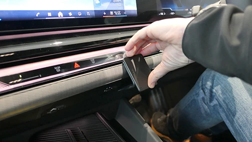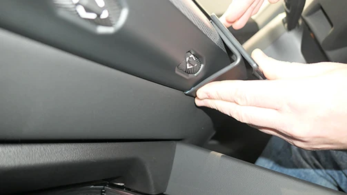 Press foward on the lower part of the mount so the lower edge hooks into the gap in the dashboard.