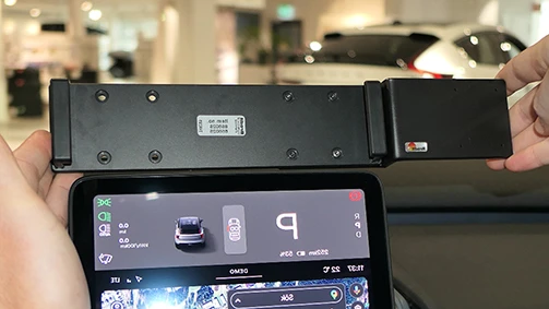 Choose if you prefer to have the device installed on the driver's or passanger's side of the screen, and place the face plate onto the corresponding side of the mount. Make sure the face plate is on the correct side and attach it to the mount base with the included screws (Phillips screwdriver). Place the mount above the screen.