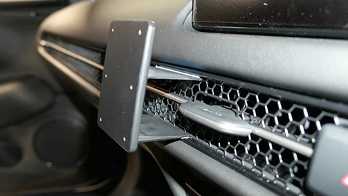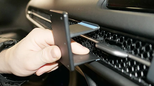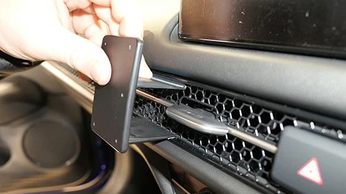 Press the upper part of the mount downward and forward. Press the upper part forward so the edge hooks/snaps under the frame surrounding the air vent.