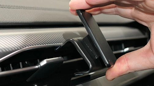 Press forward on the lower part of the mount. Hook the angled lower edge over the frame surrounding the air vent housing.