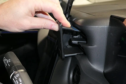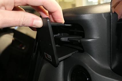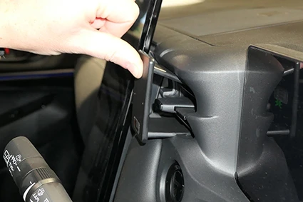 Press the upper part forward so the edge hooks/snaps under the frame surrounding the air vent.