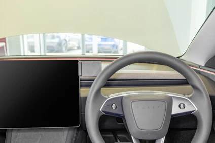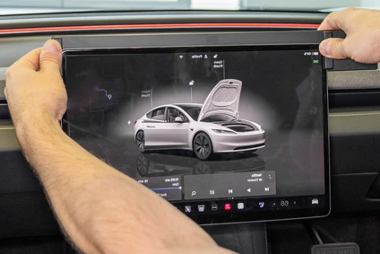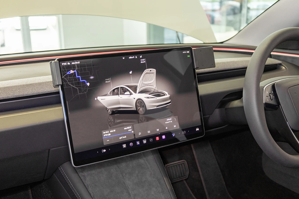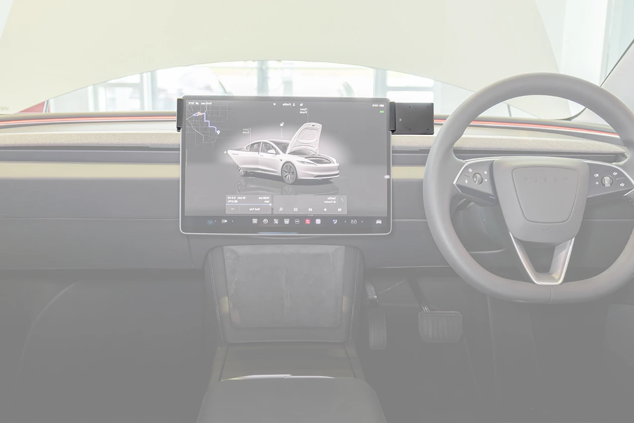 Hold the mount over the screen so the mounting plate is on the driver's side. Slowly and firmly, press down on both sides of the mount to slide/hook it onto the screen. Gently flex the sides out to ease the installation. Press downward until the mount is securely in place.