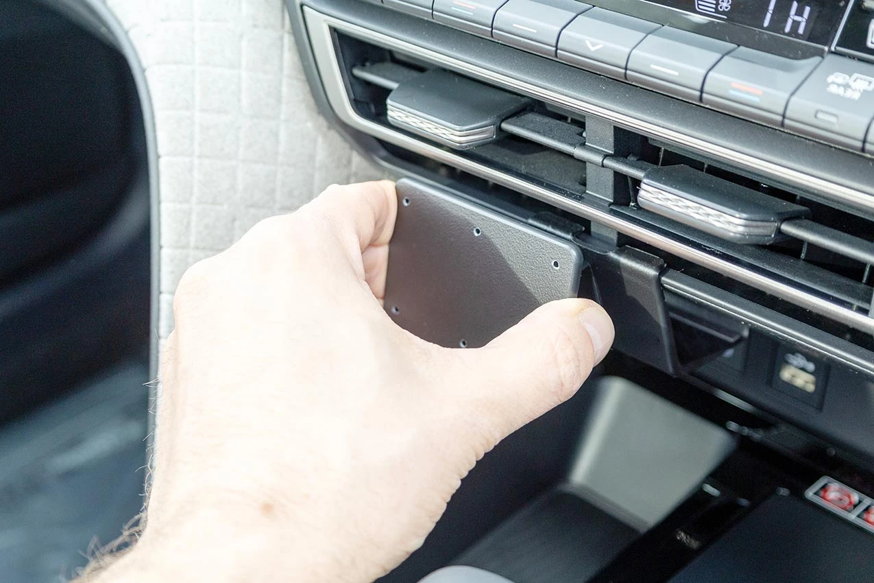 Use the enclosed alcohol pad to clean the area where the mount will be installed. Peel off the adhesive tape cover. Place the upper edge of the mount centered on the bottom frame of the air vents.