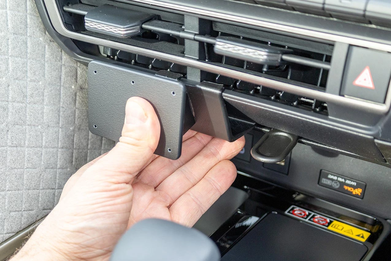 Press the thin ends of the included gap openers into the gap in the center console, to widen the gap in either side of the mount.