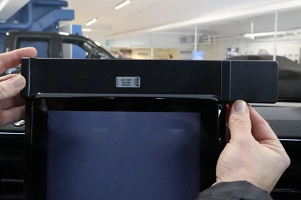 Use the enclosed alcohol pad to clean the area where the mount will be installed. Peel off the adhesive tape cover. Set the screen in its highest position. Hold the mount over the screen so the mounting plate is on the driver's side.
