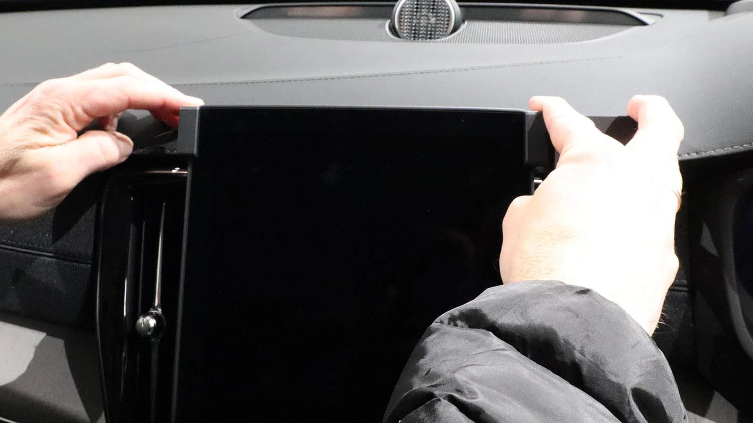 Slowly and firmly, press down on both sides of the mount to slide/hook it onto the screen. Gently flex the sides out to ease the installation. Press downward until the mount is securely in place.