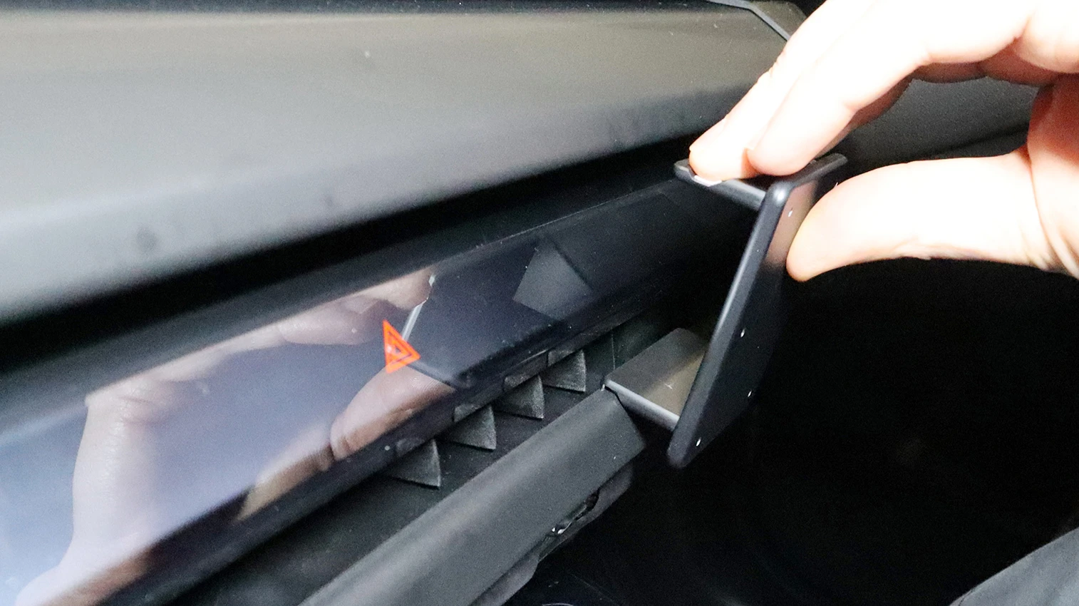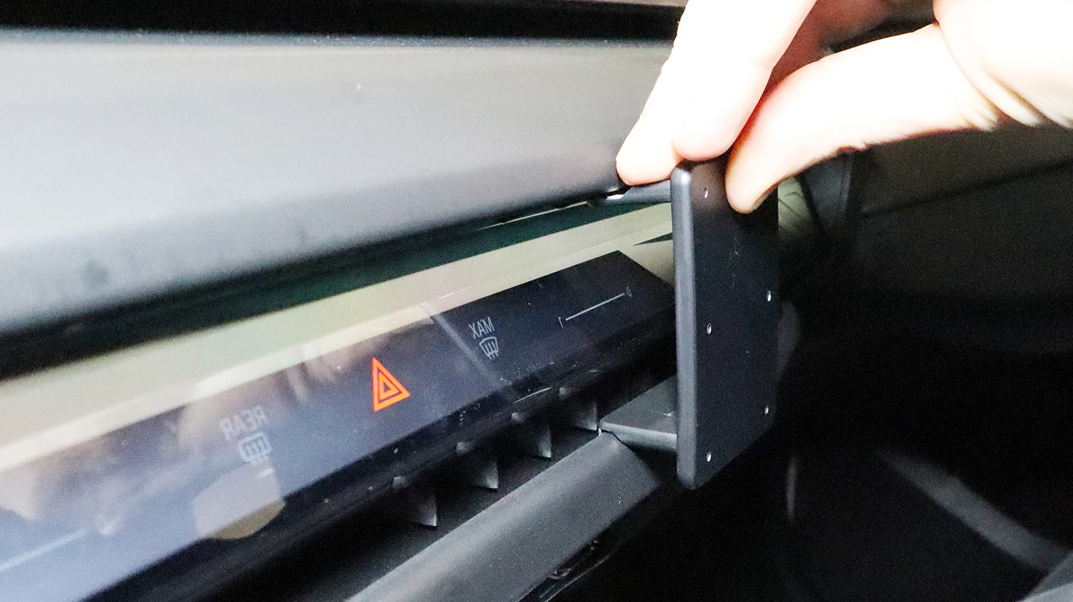 Use the enclosed alcohol pad to clean the area where the mount will be installed. Peel off the adhesive tape cover. Place the grooved edge on the lower part of the mount into the gap between the air vent housing and the frame surrounding the air vent.