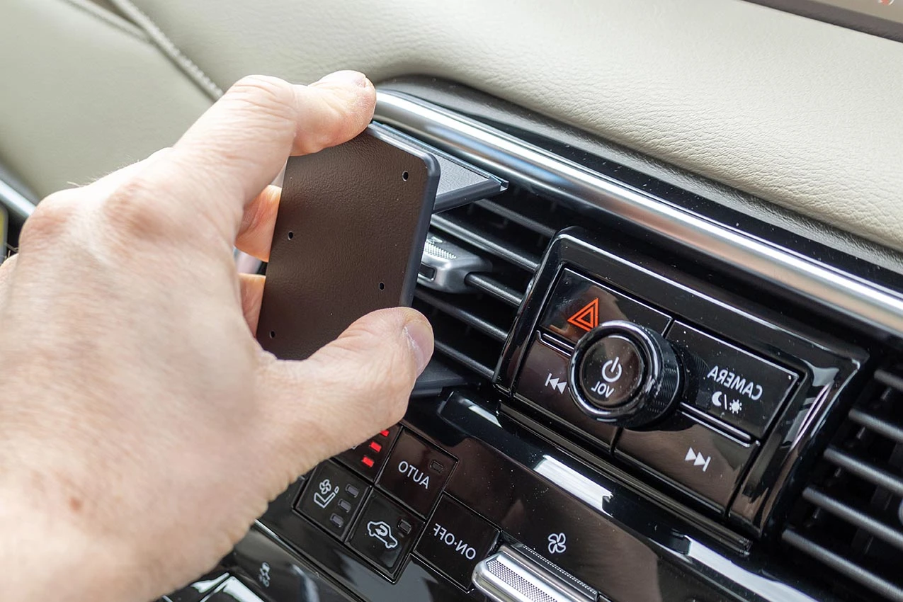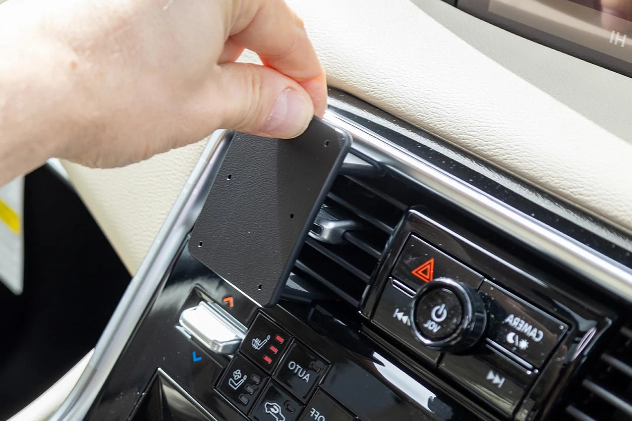 Use the enclosed alcohol pad to clean the area where the mount will be installed. Peel off the adhesive tape cover. Place the flat lower edge of the mount onto the air vent frame.