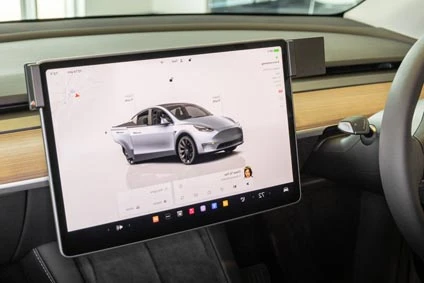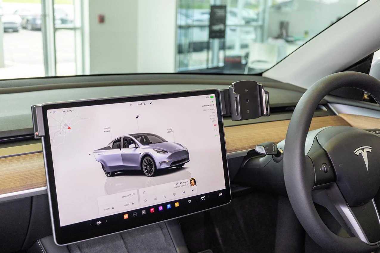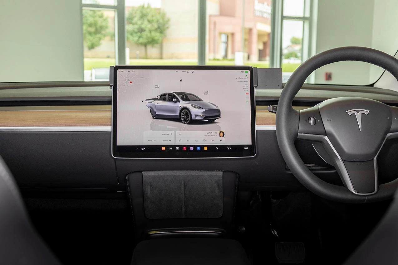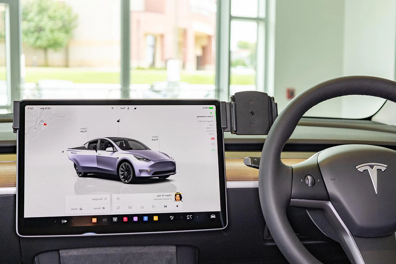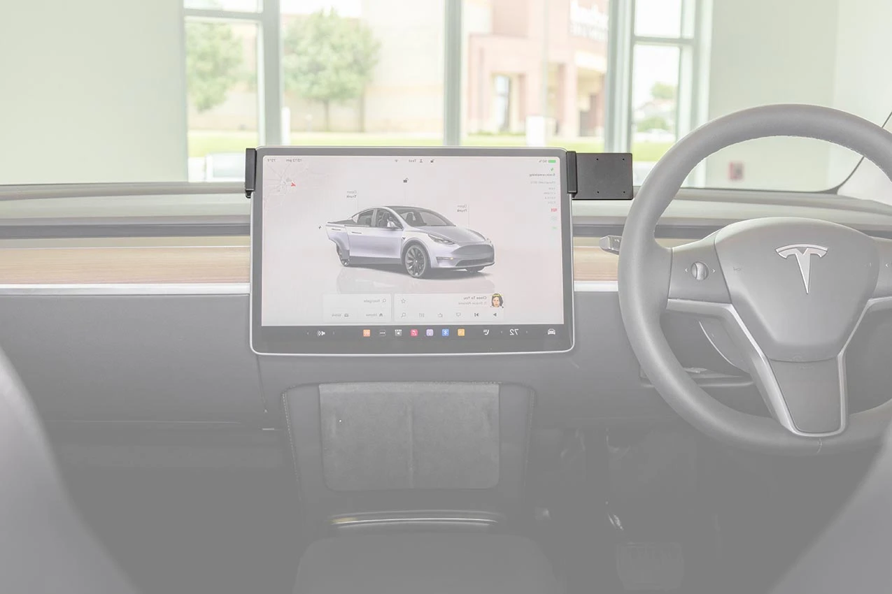 Hold the mount over the screen so the mounting plate is on the driver's side. Slowly and firmly, press down on both sides of the mount to slide/hook it onto the screen. Gently flex the sides out to ease the installation. Press downward until the mount is securely in place.