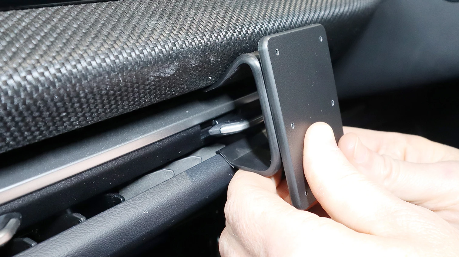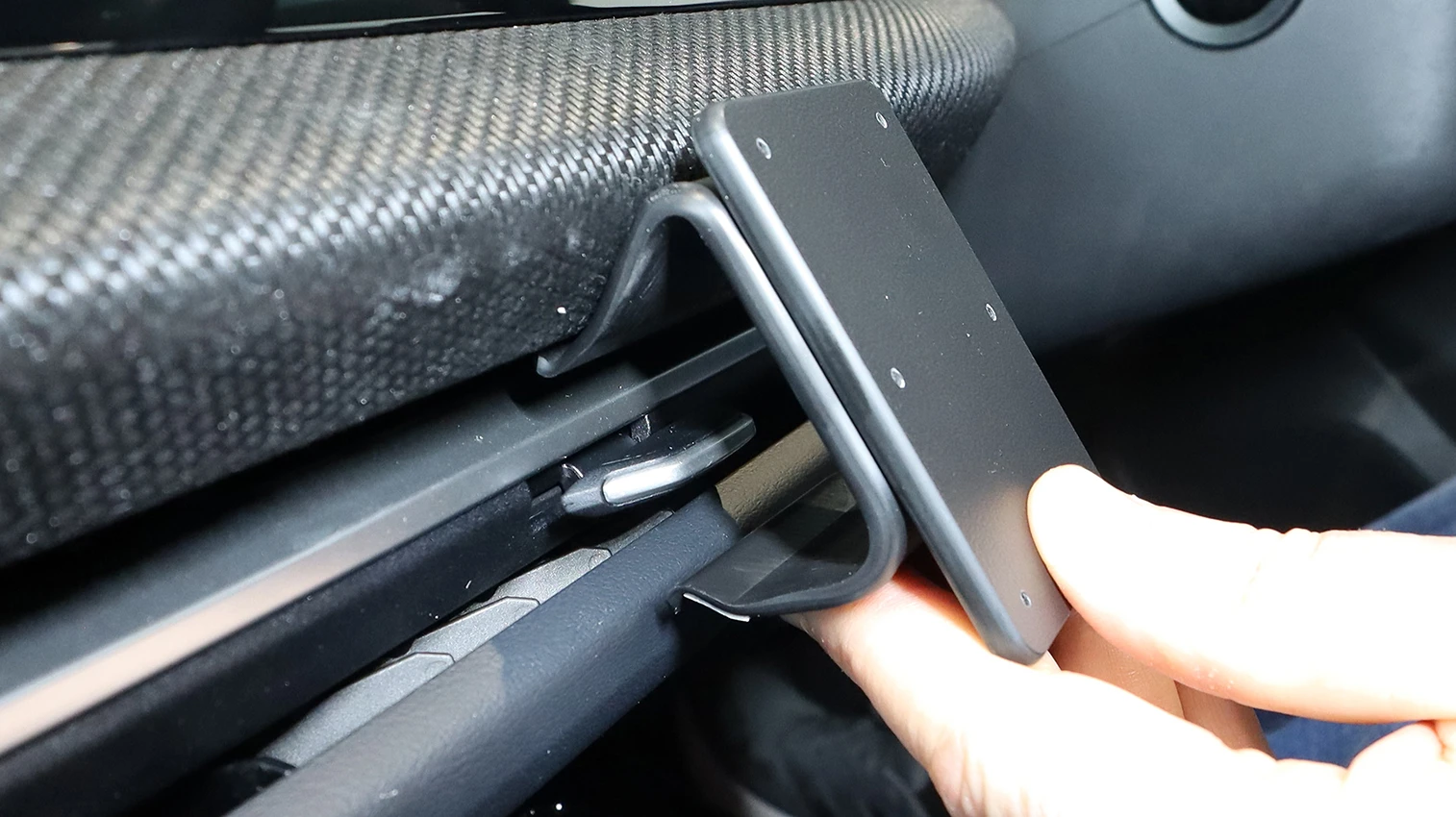 Press the lower part of the mount upward and forward. Hook the lower edge over the frame surrounding the air vent.