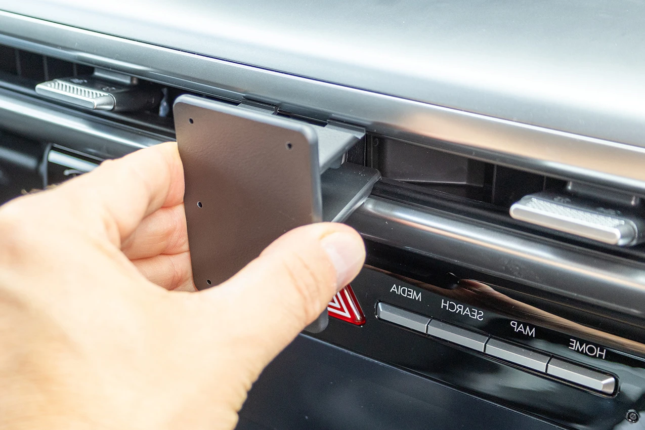 Use the enclosed alcohol pad to clean the area where the mount will be installed. Peel off the adhesive tape cover. Center the mount over the divider between the center air vents. Hook the longer, lower edge of the mount onto the air vent frame.