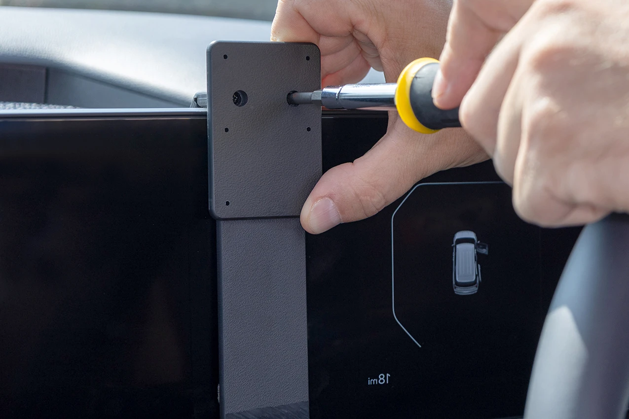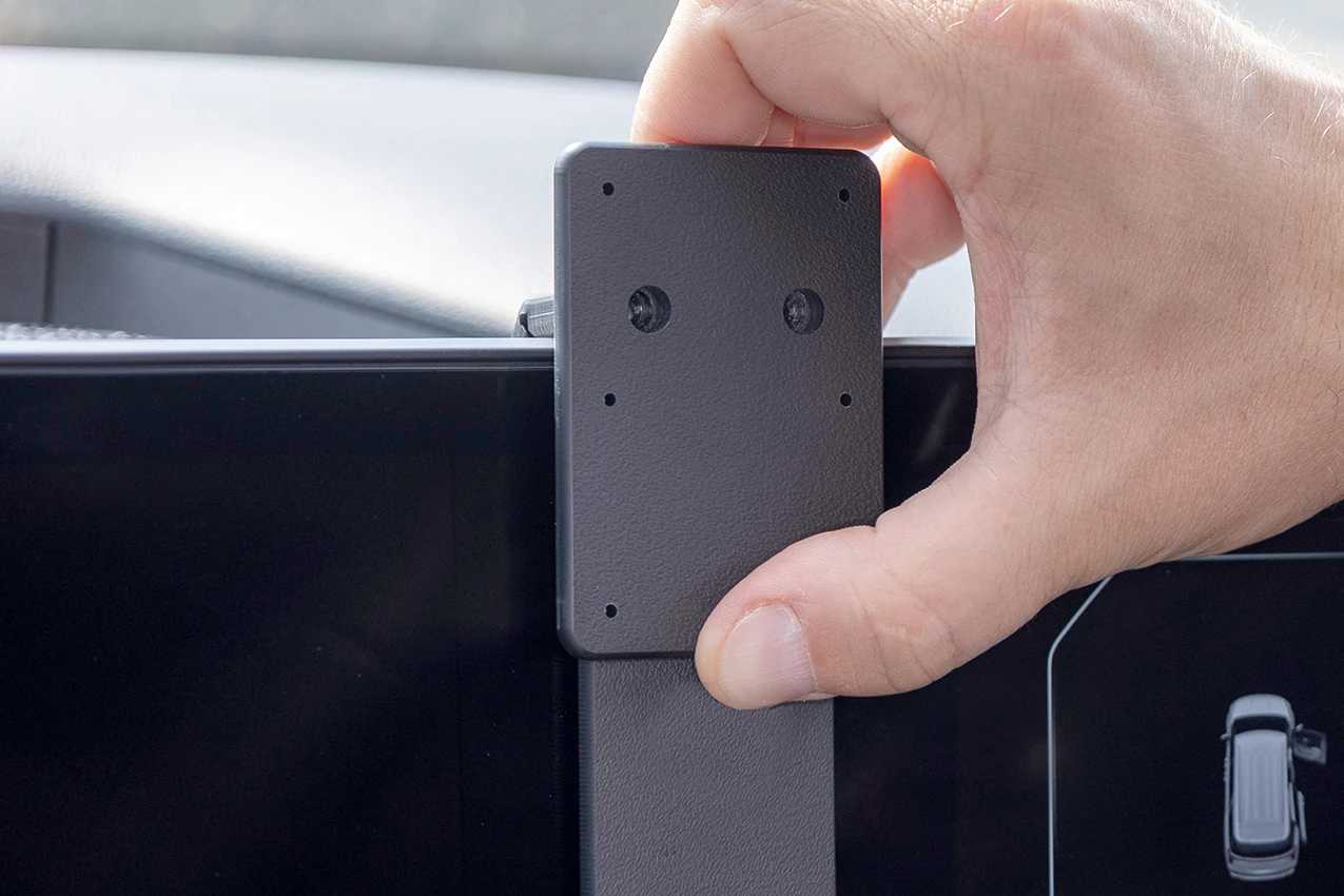 Use the enclosed alcohol pad to clean the area where the mount will be installed. Peel off the adhesive tape cover. Position the mount between the instrument and infotainment screen. Hook the lower lip under the screen frame.
