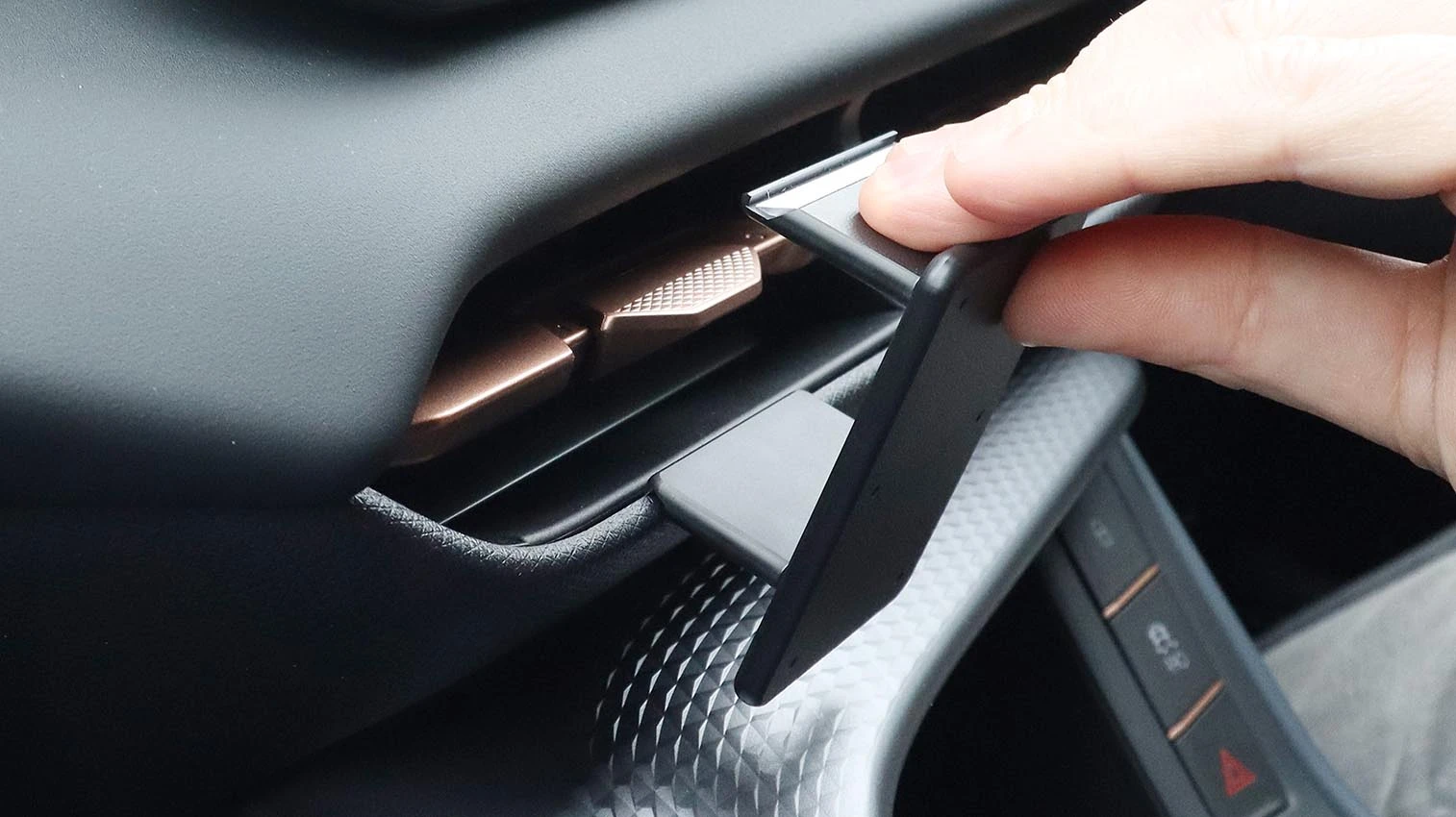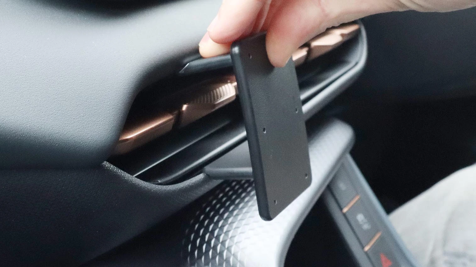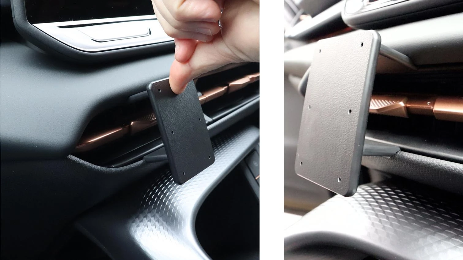 Hook the grooved edge on the upper part of the mount under the frame surrounding the air vent.