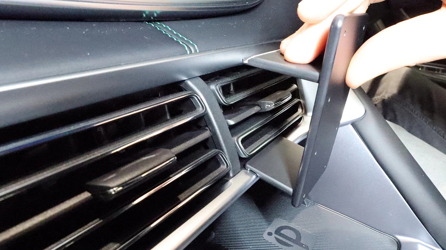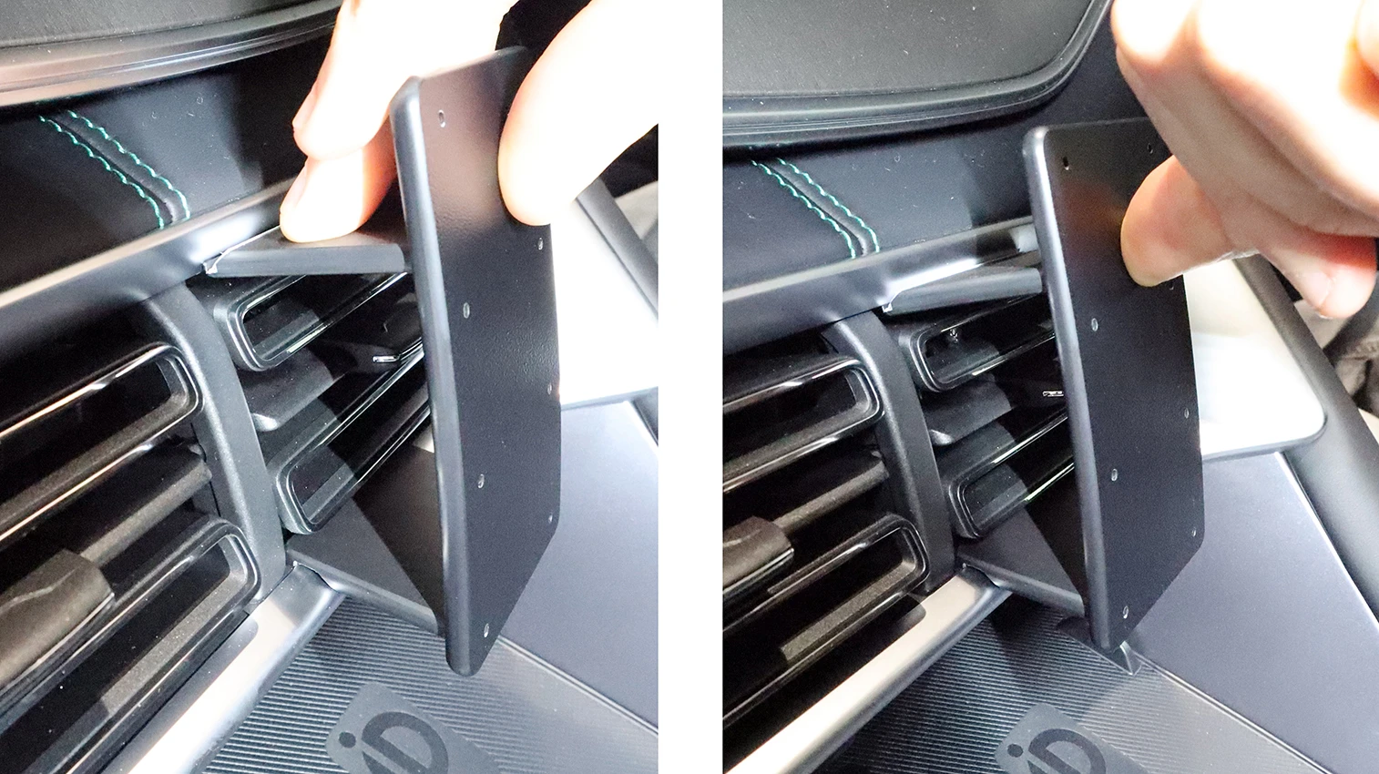 Press the mount upward and forward. Press forward on the upper part of the mount so the edge hooks under the frame surrounding the air vent.