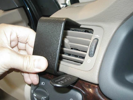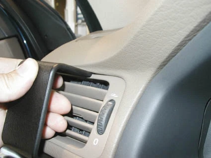 Press firmly forward on the upper part of the ProClip so the grooved edge goes into the gap between the dashboard and the air vent frame. Press until you see or hear/feel it snaps into place.