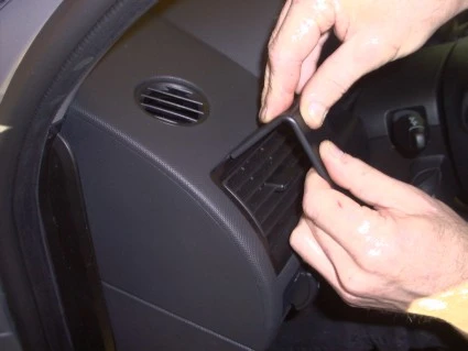 Press the long upper part of the ProClip into the gap between the dashboard and the frame surrounding the air vent. Press hard until you hear/feel it snap into place.