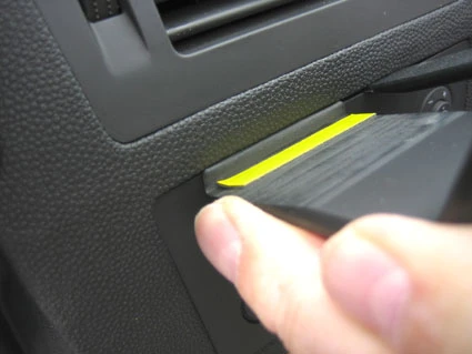 Press the thin end of the enclosed gap opener into the gap between the frame surrounding the control panel and the dashboard, to widen the gap. Peel off the adhesive tape covers on the ProClip. Press the curved edge on the lower part of the ProClip into the gap next to the gap opener.