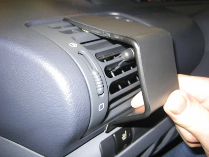 Press the curved edge on the upper part of the ProClip into the gap between the air vent and the dashboard. Flip the ProClip downwards/forwards so the curved upper edge hooks under the dashboard. Press firmly forwards on the air vent so you hear/feel it snaps back into place.