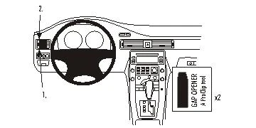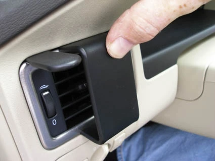 Press the gap openers into the gap between the frame surrounding the air vent and the dashboard. Press forwards on the upper part of the ProClip so the grooved edge goes into the gap between the gap openers. Press until you hear/feel it snaps into place. Pull out the gap openers.